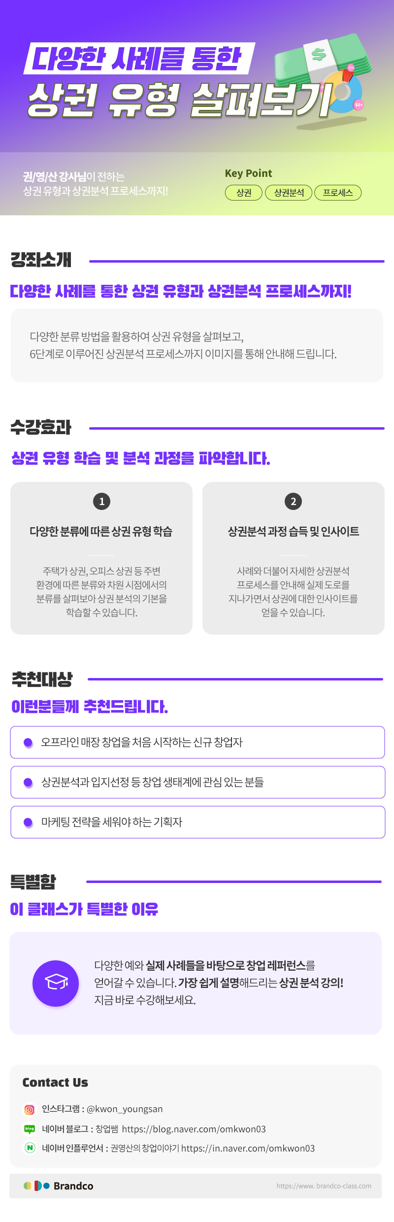 오피스 상권, 주택가 상권, 번화가 상권 등 상권분석에도 주변 환경에 따른 다양한 유형의 상권이 있습니다. 사진과 사례를 살펴보면서 어느 매장이 어떤 상권에 위치해 있는지 알아보고 인사이트를 얻을 수 있습니다.