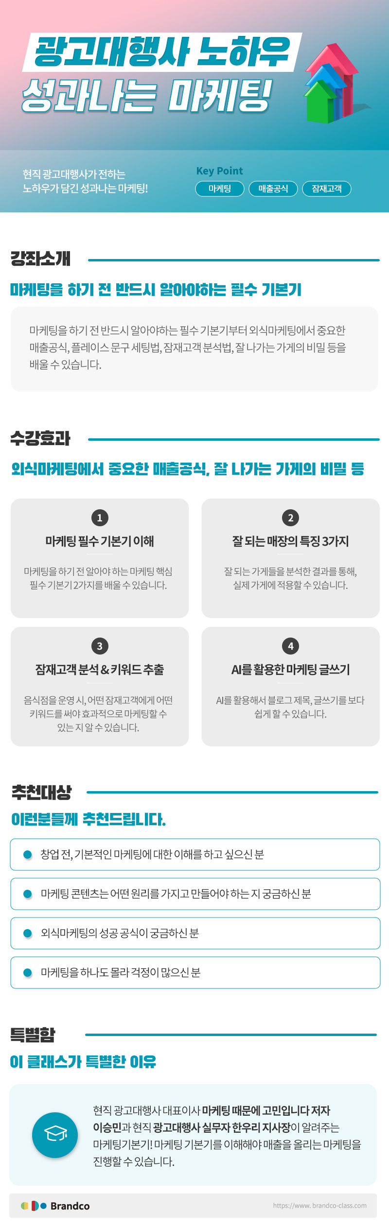 마케팅을 하기 전 반드시 알아야하는 필수 기본기부터 잘 나가는 가게의 비밀 등을 배울 수 있습니다.