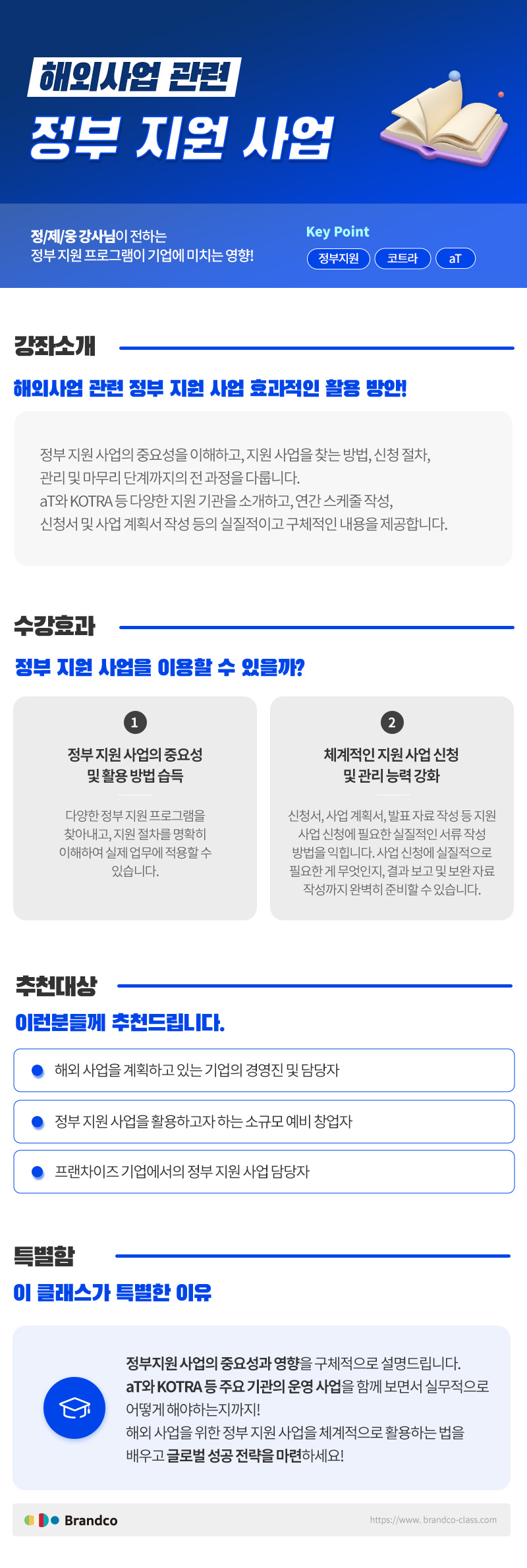 국내 기업들이 해외 사업을 추진할 때 활용할 수 있는 다양한 정부 지원 프로그램을 심도 있게 탐구합니다. 본 강의는 정부 지원 사업이 기업 업무에 미치는 영향을 이해하고, 효과적으로 활용할 수 있는 방법을 제시합니다.