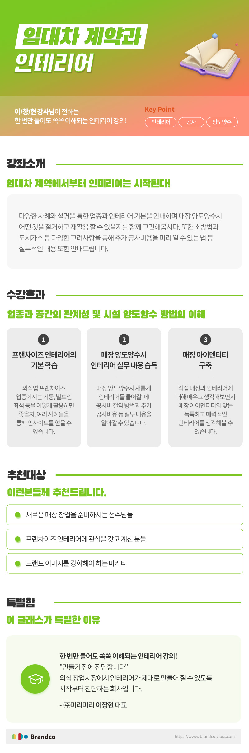 업종과 공간의 관계성을 다양한 사례를 들어 소개하고, 시설 양도양수 방법을 안내드립니다. 그리고 양도시 추가 공사비용은 어떤 방식으로 책정되는지! 사례와 함께 프랜차이즈 인테리어의 기본을 알아봅시다.