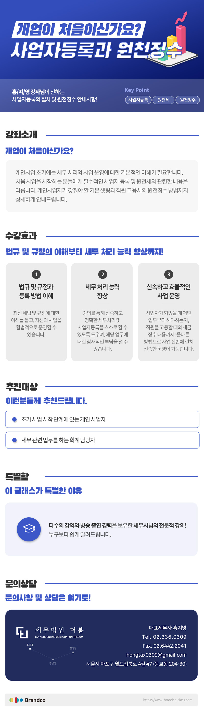 사업자등록의 절차를 함께 알아보고, 직원 고용시의 원천징수 안내사항을 세밀하게 안내드립니다.