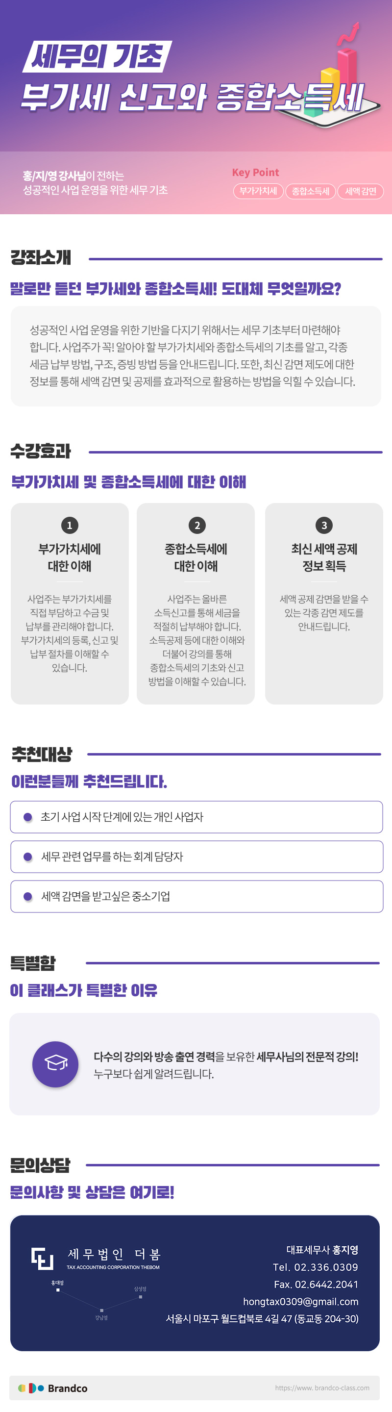 사업자가 성공적으로 사업을 운영하기 위해서는 부가가치세와 종합소득세에 대한 기초 지식이 필요합니다. 부가세와 종합소득세의 기초와 신고 방법, 각종 세액 공제 및 감면 방법을 정확하게 이해하고 올바른 세무 신고를 할 수 있도록 안내드립니다.