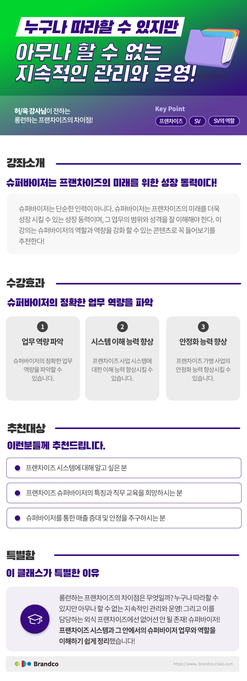 "롱런하는 프랜차이즈의 차이점은 무엇일까? 누구나 따라할 수 있지만 아무나 할 수 없는 지속적인 관리와 운영! 그리고 이를 담당하는 외식 프랜차이즈에선 없어선 안 될 존재! 슈퍼바이저! 프랜차이즈 시스템과 그 안에서의 슈퍼바이저 업무와 역할을 이해하기 쉽게 정리했습니다!"