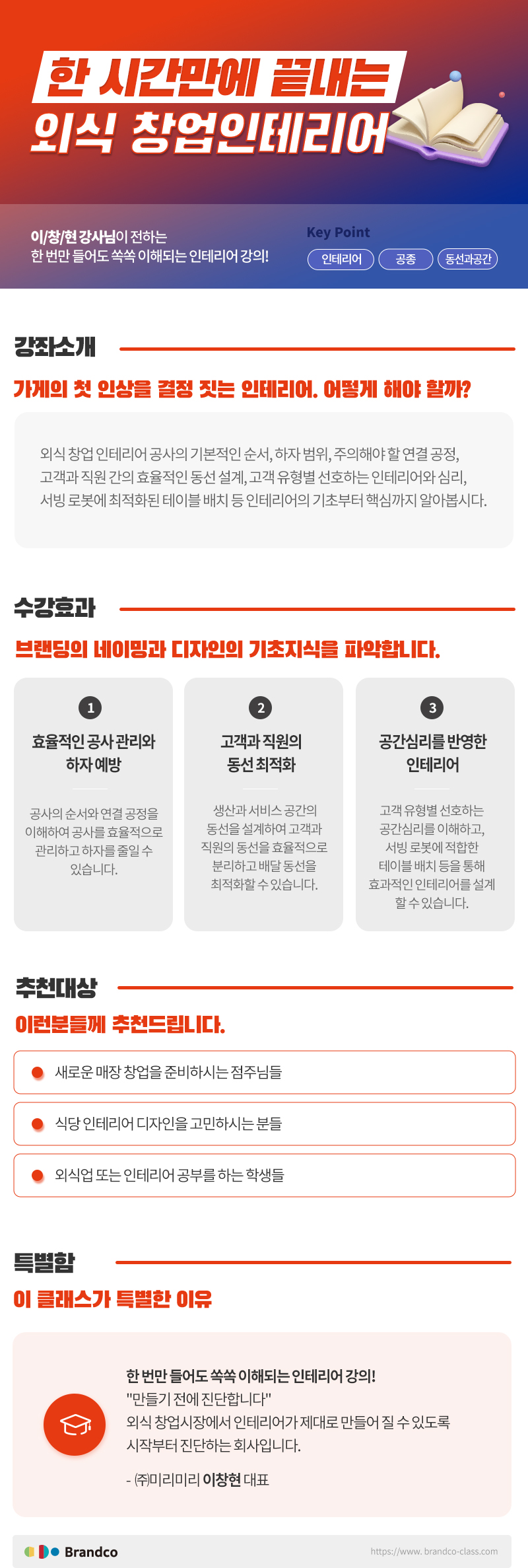 외식 창업 인테리어 공사의 기본적인 순서, 하자 범위, 주의해야 할 연결 공정, 고객과 직원 간의 효율적인 동선 설계, 고객 유형별 선호하는 인테리어와 심리, 서빙 로봇에 최적화된 테이블 배치 등 인테리어의 기초부터 핵심까지 알아봅시다.
