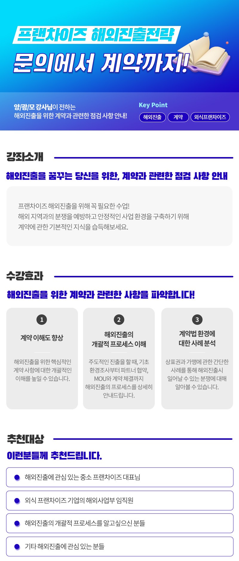 프랜차이즈 해외진출을 위해 꼭 필요한 수업! 해외 지역과의 분쟁을 예방하기 위한 사전 대비로 계약과 관련한 기본 강의를 수료해봅시다.