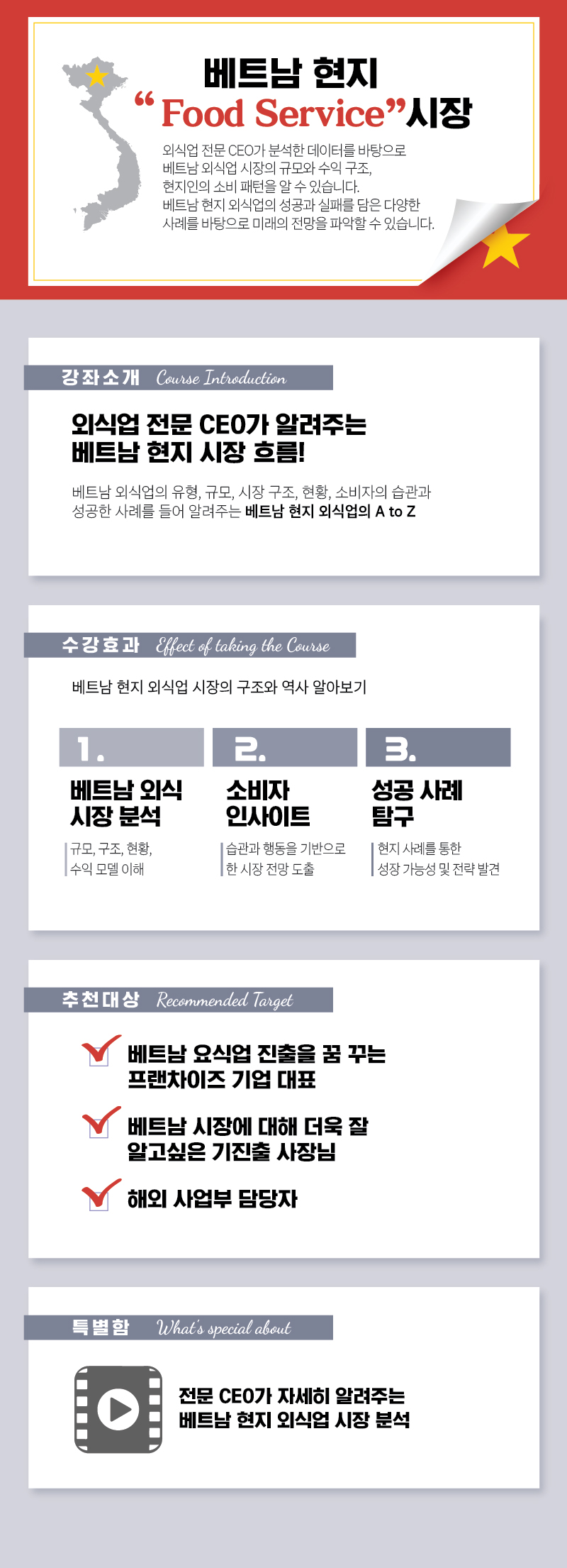 외식업 전문 CEO가 분석한 데이터를 바탕으로 베트남 외식업 시장의 규모와 수익 구조, 현지인의 소비 패턴을 알 수 있습니다. 베트남 현지 외식업의 성공과 실패를 담은 다양한 사례를 바탕으로 미래의 전망을 파악할 수 있습니다.
