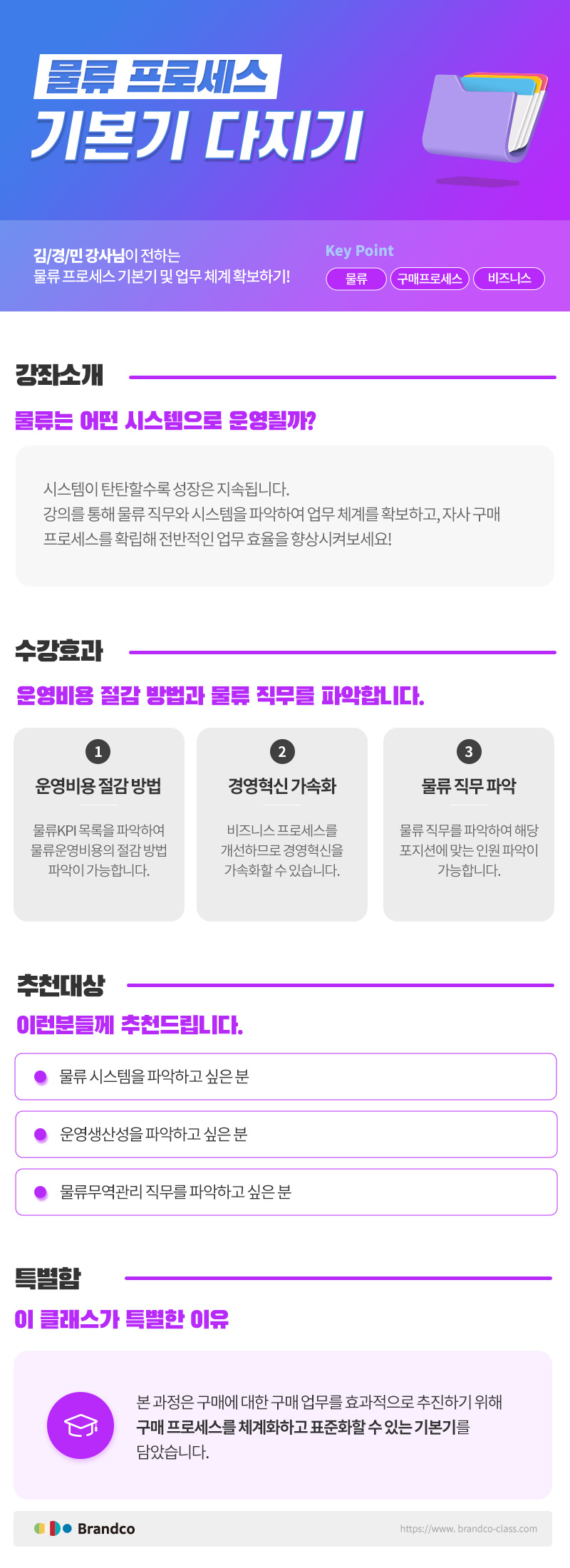 시스템이 탄탄할수록 성장은 지속됩니다. 강의를 통해 물류 직무와 시스템을 파악하여 업무 체계를 확보하고, 자사 구매 프로세스를 확립해 전반적인 업무 효율을 향상시켜보세요!
